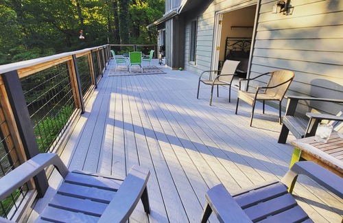 Relax and unwind on a 60 foot deck overlooking the woods while you sip coffee or enjoy reading a book. Close to the town of Brevard, Pisgah National Forest, Brevard Music Center and Ashville, Enjoy hiking, biking, white water rafting, kayaking, swimming, or visiting local breweries and wineries. Peaceful, freshly updated, quiet home equiped with kitchen supplies, outside grill, firepit and wood burning stove.