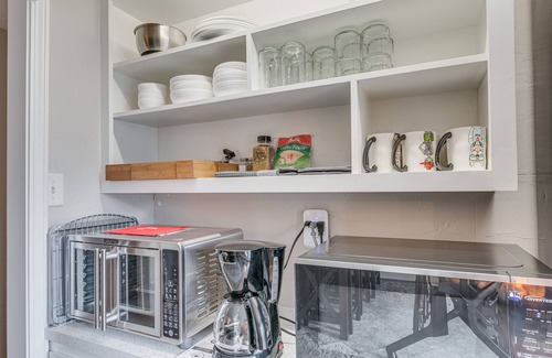 KITCHENETTE: Drip coffee maker, microwave, dishware & flatware, refrigerator, cooking basics