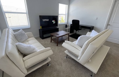 Newly constructed 4bd/2.5ba home in a new developed neighborhood. This home is open with big rooms for you to sleep comfortably. Grand master bedroom has king size bed and a twin bed, also has a master on suite with a walk in closet. Bedroom 2 has King bed with a warm inviting feeling. Bedroom 3 has 3 twin beds and a smart tv. Bedroom 4 has a queen bed and smart tv. Bonus room has 2 futons and a PS4with a 55inch tv. Fully updated kitchen with island and granite countertops and more. Living room has a sleeper sofa and a nice 55inch tv for you to enjoy