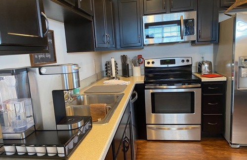The kitchen is fully equipped with a range, dishwasher, microwave, Keurig coffee maker, and cookware, allowing you to prepare meals with ease. The open-plan concept creates a seamless flow between the kitchen, dining area, and living room. A dining table for four is provided, and the kitchen table can also serve as a convenient workspace.