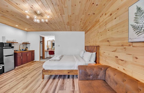 Have a relaxing stay in this charming cabin themed unit with modern amenities and tasteful décor, perfect to nestle up in on a snowy day as you watch the flakes fall gentle onto the pine trees around you.