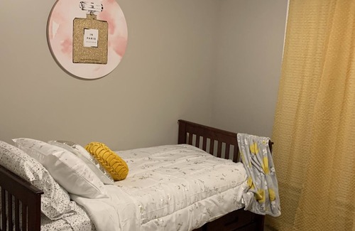 This newly renovated, 3 bedroom home, rest in a quiet neighborhood in central GreensboroYou will have full access to the property to include, the cozy living area with a mounted flat screen TV, beautiful fully equipped kitchen, washer and dryer, front porch seating, a beautiful back deck, and spacious back yard.