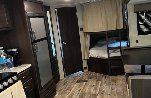 Unwind in Hanford at this lovely recreational vehicle. This cozy RV features 1 queen bed in the bedroom, a living room with 2 bunk beds and 1 sofa bed, and a bathroom with a shower. Guests can enjoy amenities like AC, WiFi, and heating during their stay. Experience what Hanford has to offer with a stay at our recreational vehicle.