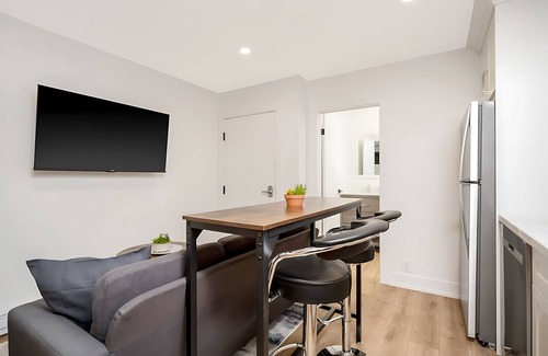 This large studio apartment has a double-size murphy bed and can accommodate 2 guests at a time. The kitchen is newly renovated with stainless steel appliances, and includes a full sized fridge/freezer combo, dishwasher, oven, stove-top and microwave. There is a high-top table with bar seating for 2 , so you can enjoy home-made meals, or just flip open some take-out containers! The living room has a comfortable sofa and a smart TV, with high speed internet connection.