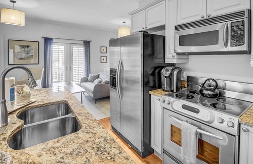 The fully stocked kitchen, featuring stainless steel appliances, a Keurig coffee maker, and all the essentials, makes it easy to prepare a homemade meal or snack between adventures. The modernized bathroom, complete with white subway tile and premium toiletries, offers a refreshing retreat after a sun-soaked day.