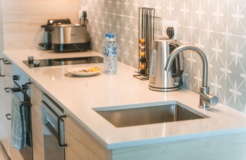 The kitchenette is equipped with modern black appliances, including a cooking hob, stove-top, toaster, and electric kettle, allowing you to prepare your favorite meals with ease.