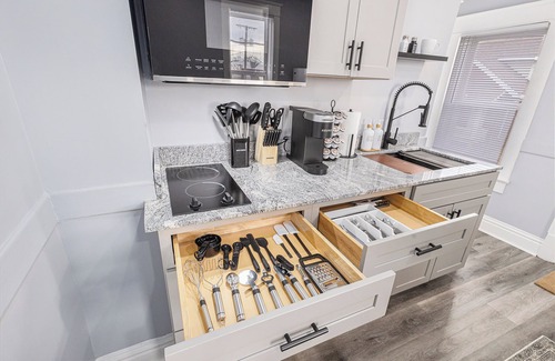 - The kitchen is fully stocked with a fridge/freezer, sink, stove, oven, microwave, toaster, blender, and coffee maker. We also provide essential items like plates, cups, cookware, utensils, and paper towels.