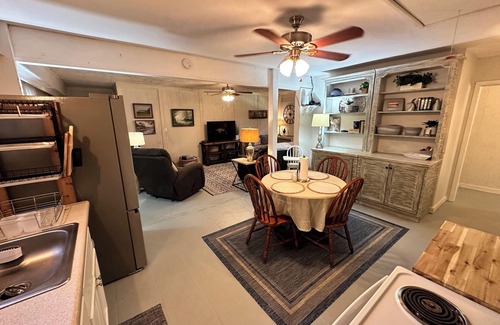 We describe our home as a rustic "no frills" fish camp, yet you will have everything you need for a comfortable and cozy stay. The living room will comfortably fit a family for movie night. The first bedroom has a spacious king bed, while the second larger bedroom can comfortably sleep 4 with a queen and twin daybed with trundle. This second bedroom is a great hang out space for the kids with another small couch and TV set up. The home is toddler friendly, there is a pack and play and high chair available for use. We also supply child safety features including door knob covers, outlet protectors and a cabinet lock for under the kitchen sink. There is ample storage in the bathroom. Laundry is available in the garage where you will also find for your use during your stay: 2 kayaks with paddles, a wide range of life jackets, outdoor games, fishing poles and more.
