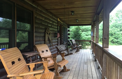 This cozy cabin features a rocking chair front porch with views of open fields and mountains. The front yard is perfect for throwing football or playing games. The private road is flat and great for kids to bike or to take morning walks. As you enter the cabin the open floor plan is ideal for family gathering. WiFi, Satellite TV and board games are provided. The Kitchen is stocked with cooking utensils and dinnerware. 2 of the 3 bedrooms are on the first floor - one with a king bed and one with a queen. Full bath upstairs and downstairs. Upstairs loft area has a futon, TV with dvd player, two twin beds. The back deck overlooks the creek with outdoor tables/seating, propane grill, and hot tub. Enjoy family cookouts, unwinding in the hot tub looking at the stars or hanging by the firepit, all with the sounds of the rumbling creek!