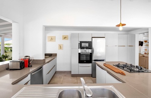 Built over several buildings connected around the central swimming pool, villa Crush welcomes guests in its bright spaces gently blown by the trade winds. Ideally located in Grand-Cul-de-Sac, this contemporary-style vacation home features a comfy living room furnished with a large sofa and an HDTV. The high, white, vaulted ceiling bring a unique cachet and authenticity to this most relaxing indoor space. On the side, the fully-equipped kitchen opens onto the terrace through a bar with stools, the perfect setup to chat over a coffee and enjoy the mild tropical air.
