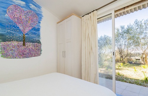 The bedroom offers a restful sanctuary, with direct access to the outside and decorated to inspire tranquillity and comfort.