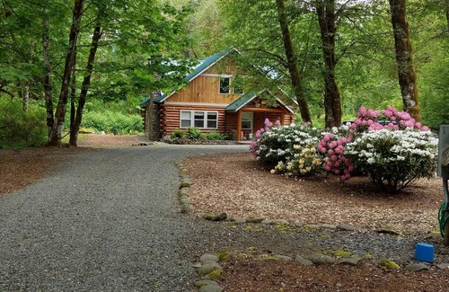 Enjoy a long weekend in a handcrafted log home approx 1800 sq ft. Nestled on five acres in a grove of trees along the banks of the Tilton River, four miles from Morton, Washington.