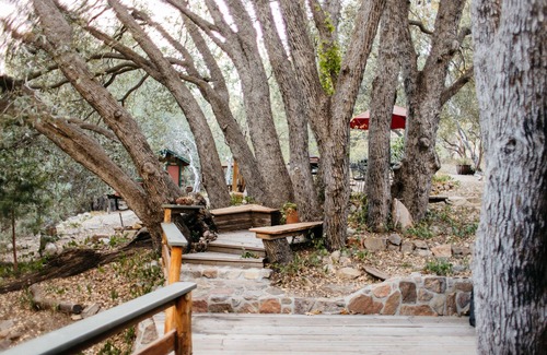 This Custom Dodecahedral Cabin is set amid a peaceful neighborhood in Idyllwild, CA. The cozy, storybook home fits perfectly within the forest, dwarfed from its center by an Ancient Ponderosa Pine. Resting atop a full acre of private, old-growth forest, The Fox & Leopard Treehouse overlooks a seasonal stream which runs all the way down beneath the stone bridge at the entrance to the estate.