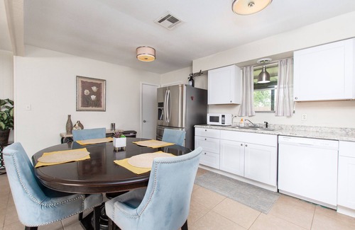 2 bedrooms and 1 bathroom recently updated with open concept living. 1 car carport but parking for 4-5 cars (driveway and off road). Bedroom 1- Queen sized bed, Bedroom 2- full size bed. Kitchen features dishwasher, microwave, convection oven, stove, and traditional oven. Large laundry room area is perfect for storing coolers, food, or any other travel items. Also available, queen size air mattress. Huge sectional is also super comfy! Out door area is screened and has patio table as well.