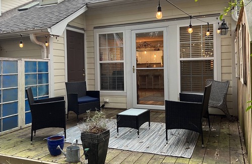 Adorable and spacious BEACHY 2 bedroom condo with a Cozy lit back deck for relaxing. It is surrounded by Gorgeous Oak Trees in a quiet -mostly adult -neighborhood. It’s close to great shopping, theatre, beach, Touring Gardens and GREAT Restaurants. Community pool walking distance from front door.