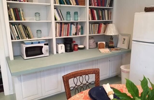Enjoy all that Beaufort has to offer from the comfort of our charmingly decorated antique filled one bedroom, one bath guest cottage nestled in our garden. Featuring an open living room with new flat screen tv, wi-fi and brand new comfy sleeper-sofa. And if you love to read (like we do!! ) bookcases filled with books & cookbooks, adjoins a fully equipt open kitchen with 2 fridges, oven, and gourmet amenities such as microwave, 2 coffee machines, coffee/coffee grinder,selection of teas and teapot,antique dining room table with 4 chairs and set with attractive tabletop items. Large bedroom with comfy queen bed with a coastal decorated full bath with shower and roomy closet, gorgeous shell encrusted mirror and Annie Sloan painted cabinet. Bedroom has brand new MATOUK bedding and cotton bedding. An antique dresser with scented drawer liners, large walk-in closet with tons of room and washer-dryer. Beach baskets, towels and toys are stored in this closet for guests to enjoy!