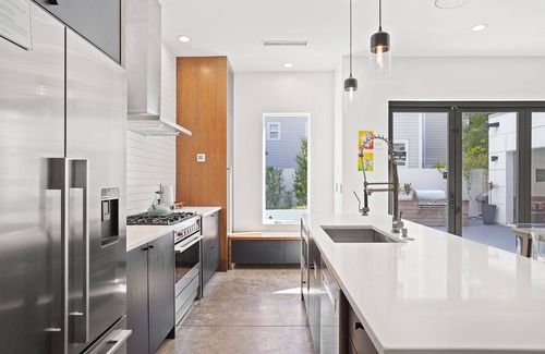Day Dreamer has an outdoor space built for entertaining. Grill out on the built in propane grill while the kids (and adults too!) splash around in the sparkling pool. Enjoy the use of the outdoor pool house for meals in the shade, or catching up on a good book. The second floor roof top is the perfect place to catch a good tan and enjoy a fruity cocktail. The sliding glass doors to the living area of the home expand open so that your guests inside are still just as much part of the fun. The indoor space boasts a generous living area with cable TV, wifi, bluetooth speakers, games, books, and a large dining table. Brand new appliance and sleek cabinetry accent the gourmet kitchen that any chef would be satisfied to cook in. Each bedroom is equipped with brand new king size mattresses, luxurious bedding, flat screen TVs, and private bathrooms. In one of the bedrooms a unique bunk room can be discovered behind an impressive barn door and has two sets of built in twin size bunks. After a long day of fun in the sun, get the s'mores ready, grab a bottle of wine, and head up to the roof top for a fireside hangout. Every detail was considered and no expense was spared in ensuring this vacation home is one you will remember even long after you depart.