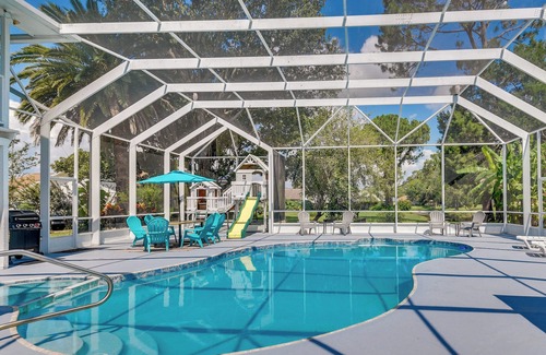 OUTDOOR LIVING: Private lanai w/ pool & heated spa, gas grill, umbrella-covered dining area, kids’ play structure w/ slide & gazebo w/ lounge seating, backyard w/ swing bench, fire pit, balcony, canal, front porch w/ lounge seating