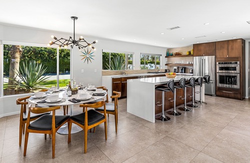 Nestled in prestigious Deepwell, this beautifully updated 4BR/3BA Mid-Mod villa (circa 1954) boasts mountain vistas and a spacious open design that encourages togetherness. Gather around a gas fireplace, cook in a sleek chef’s kitchen, enjoy family-style dining with backyard views. Decadently furnished for comfort and unfolding to the outdoors; the airy living space is awash with natural light, fine art and lavish amenities. Beds: K,Q,Q,K (or T,T)
