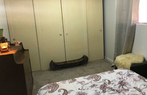 The Zen Garden room at Deer Lodge features a queen size, green tea infused memory foam mattress and bamboo fiber pillows. Separate entrance out to balcony. Black out curtains for sleeping in! One shared bathroom across hallway.