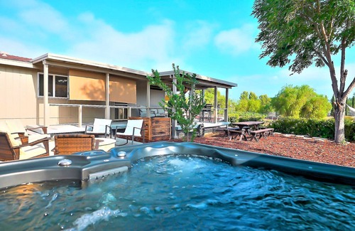 Enjoy spectacular views of the vineyard, fruit trees, and hot air balloons from the backyard porch. Indulge in a country backyard style BBQ or just venture out to the various entertaining areas from a brand new hot tub, horse shoe pits, swing set, and relaxing hammock overlooking the vineyard. Sit around the newly added outdoor fire pit and continue your wine tasting in the warmth of family and friends. Enjoy shopping in Old Town Temecula and dining in world class restaurants. Experience the Wine Country like never before at the Del Vino country cottage.