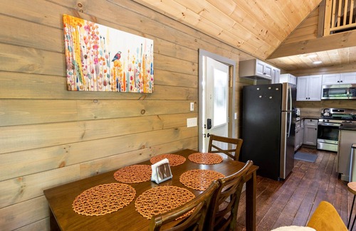 Rhodo Retreat is a delightful modern 2BR/2BA cabin located in Beech Mountain less than 10 minutes to the slopes of Ski Beech with winter activities including skiing, snowboarding, ice skating, and snow tubing. The slopes convert to hiking trails, mountain biking trails, chairlift rides, and disk golf during the warmer months. Buckeye Recreation Center is just 5 minutes from the cabin. Tastefully furnished and decorated with accommodating space for up to 8 guests, this cabin boasts a stone gas fireplace, hot tub, and wood-burning Solo Stove style fire pit in the yard.