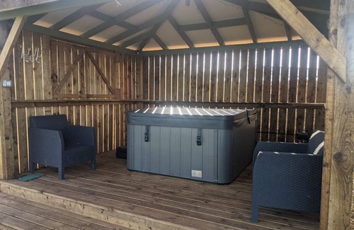 Stepping outside, the private decking area serves as a suntrap, perfect for basking in the warmth with a morning coffee or an evening glass of wine. Outdoor furniture is provided to enhance your comfort. Just behind the carriage, the covered garden hot tub awaits, positioned to offer delightful views across the meticulously maintained gardens. The hot tub is available all day, every day, until 11 pm, adding a touch of luxury to your retreat.