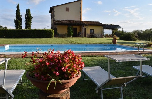 This well-appointed villa, converted from a disused stable and tobacco-drying shed, stands on an acre of land on a quiet wooded hillside, with a gorgeous vista of the Tiber valley, the Monti Martani and the ancient town of Todi, one of central Italy's loveliest spots. It has its own enclosed garden, swimming pool and olive grove. It is furnished with period pieces and equipped with modern facilities and wifi. All bedrooms have ceiling fans, and the windows are fitted with mosquito nets and shutters.