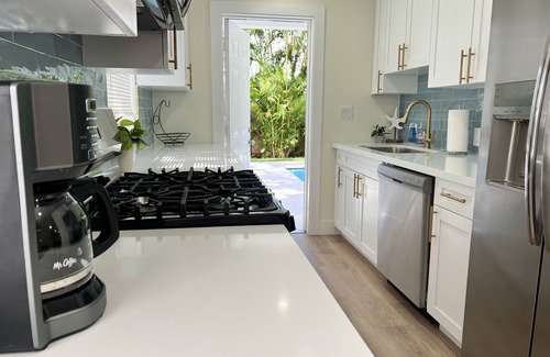 With cozy interiors perfect for smaller gatherings, and a backyard that offers a spacious area for everyone to come together for a barbeque, a swim in the pool, or play a game of corn hole, Delray Paradise is the ideal home base for your Delray Beach getaway!