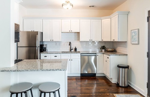 After a day out and about in the city, enjoy some down time with a movie or your favorite show in the living room which features a large TV and comfortable sofa and seating options. The connected, fully equipped kitchen with stainless steel appliances and Keurig coffee maker provides the option to enjoy a home cooked meal without missing any of the action, with seating at the island barstools for 2. For some fresh air any time of day, grab your coffee or an evening cocktail and pop out onto the front porch, featuring additional outdoor seating for 2.