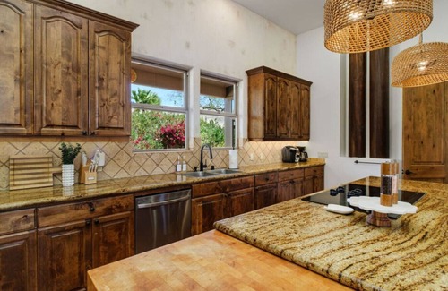 Kick back in chaise lounges or relax on the daybed by the pool. You can also rest in the shade on comfy seating under the covered patio. Barbecue tasty meals on the gas grill and dine at the outdoor table. A wood-burning fireplace adds to the ambiance.