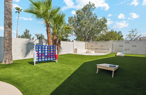 Backyard: Fully fenced with a gorgeous view of Cave Creek Golf Course and plenty of space for activities & games. We have cornhole, giant connect four, pool toys and water basketball. We do not allow any glass to be taken outside so we provide plenty of outdoor-friendly plastic cups to enjoy in the backyard space!