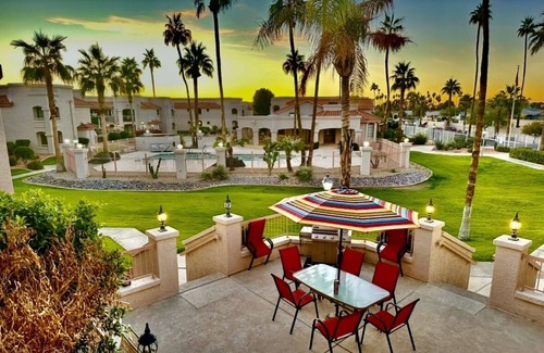 Bring the outside in with our unique groundlevel condo no stairs! Smart lock access with pin code entry and security camera. 2 bedrooms (both with queen beauty rest bedding), full sized pull out couch in living room, 2 full bathrooms (one walk in shower, one tub/shower). 55+ community (18 and under can only stay max 30 days). Steps from pool and hot tub! 30 day minimum rental. Minutes from P83 entertainment district and Peoria Sports Complex. 50 golf courses in the area along with Camelback ranch and State Farm stadium. Gated community with parking right outside the condo. Spring training teams within Minutes Drive Chicago White Sox  LA Dodgers  Seattle Mariners  Texas Rangers and  Kansas City Royals !!