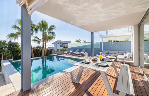 Designer Alcanada is a holiday villa in Alcudia, Mallorca with a private swimming pool 3 bedroom, 3 bathroom villa with sea view and a private swimming pool, air conditioning, Wi-Fi, near golf, sleeps a maximum of 6 people