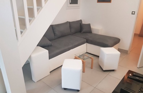 The interior consists of a living room with sofa and TV open onto a fully equipped kitchen, 2 bedrooms, one on the mezzanine, bathroom wc.