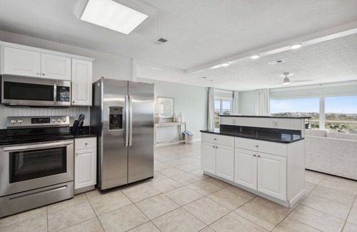 Guests will find everything needed to prepare meals at home in the updated kitchen with white cabinets and granite countertops. The adjacent dining area allows seating for six at the main dining table along with two barstools at the counter. A second table with seating for two is perfect for extra guests or playing games!