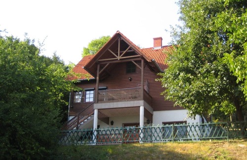 The vacation home situated on the top of the Fonyód Hill next to a forest and a nature park. That is why the house has a beautiful view to the surroundings. You can also enjoy the superb landscape during your breakfast on the covered balcony. In the holiday home you can find on 3 floors: 4 bedrooms, 3 bathrooms, huge living room with a teakitchen, dining room and a full equipped kitchen. In the huge garden you can not only sunbathung and do barbecues, but playinf football or badminton. The next beach (1500 m) is in Bélatelep, which is a very beloved lakeshore. If you are lookinf for real relaxation, peace and quiet, than you are right here!
