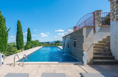 Villa Mistral Luxury villa with private pool, children's pool panoramic views Saint-Ambroix Gard Languedoc Unique water feature luxury designVilla Mistral is a stunning and family-friendly villa nestled in the scenic landscape of the Gard. The villa accommodates 12 guests and features 5 beautifully decorated bedrooms. From the spacious covered terrace, you can enjoy a breathtaking panoramic view over the rolling hills of Languedoc.With two swimming pools, an impressive double waterfall, and a secure enclosed children's pool, Villa Mistral is the perfect destination for families and groups seeking luxury and comfort in an authentic Southern French setting. Looking for a villa that combines tranquility, luxury, and nature? Villa Mistral offers an exclusive holiday experience in the heart of Languedoc. Outdoor Pool• Private pool (14 x 6 m, 1.20 1.60 m deep) with water alarm• Separate children's pool (4 x 4 m, 0.05 0.40 cm deep) securely enclosed and ideal for young children• Unique water feature a double waterfall cascading between the children's and main pool• Covered terrace with lounge area and panoramic views• Sun terrace with luxury loungers by both pools• Outdoor shower direct access to the garden with lawn• Spacious dining table and BBQ area (gas) for long summer eveningsThe pools and terraces are designed for maximum relaxation and safety, featuring secure fencing and a mesmerizing ambiance created by the cascading water. Villa Layout Bedrooms BathroomsFirst Floor (Living Area Bedrooms)• Bedroom 1: Queen-size bed (160 x 200 cm), dressing area, desk, en-suite bathroom, air conditioning, curtains, shutters, terrace doors• Bedroom 2: Two single beds (90 x 200 cm), wardrobe, air conditioning, curtains, shutters, terrace doors• Bedroom 3: King-size bed (180 x 200 cm), wardrobe, air conditioning, curtains, shutters, terrace doors• Bathroom 1 (en-suite to Bedroom 1): Walk-in shower, sink, toilet• Bathroom 2: Double sink, walk-in shower• Separate toiletSecond Floor• Bedroom 4: Queen-size bed (160 x 200 cm), wardrobe, air conditioning, curtains, shutters, terrace doors• Bedroom 5: Loft bed (140 x 200 cm 90 x 200 cm), single sofa bed (90 x 200 cm), air conditioning, curtains• Bathroom 3: Double sink, walk-in shower• Separate toiletAll bedrooms are air-conditioned and offer plenty of comfort and privacy. Living Spaces Kitchen• Spacious living room with fireplace and panoramic windows• Cozy seating area with TV• Separate dining room with direct access to the terrace• Fully equipped kitchen, including:American-style refrigeratorInduction stoveOven and microwaveDishwasherCoffee machine and bar area• Large covered terrace with dining area Weber gas barbecueThe modern yet charming interior of Villa Mistral is designed for comfort and elegance, creating an open and inviting space for families and friends. Access Parking• Spacious parking area and garage for 2 cars• Secure access via a private estate• Stairway leading to the main living areas from the parking lot Location Surroundings Distances• River beach swimming lakes: 10-15 min drive• Saint-Ambroix (shops restaurants): 5 min drive• Gastronomic restaurants wineries: 5-15 min drive• Hiking cycling trails: Direct access from the villa• Adventure park climbing courses: 10 min drive• Horse riding: 10 km• Golf course: 25 km The Gard and Languedoc offer the perfect blend of nature, culture, and gastronomy. Explore medieval villages, taste exquisite wines, and discover the best hiking trails in Southern France! Why Choose Villa Mistral? Unique family-friendly villa with two pools waterfall Panoramic views over the Gard hills Spacious bedrooms, luxury bathrooms air conditioning Fully equipped kitchen stylish living spaces Ideal for families groups (up to 12 guests) Perfect location for nature, culture relaxation Enjoy the luxury, tranquility, and nature of Villa Mistral. Experience an unforgettable holiday in the heart of Languedoc!