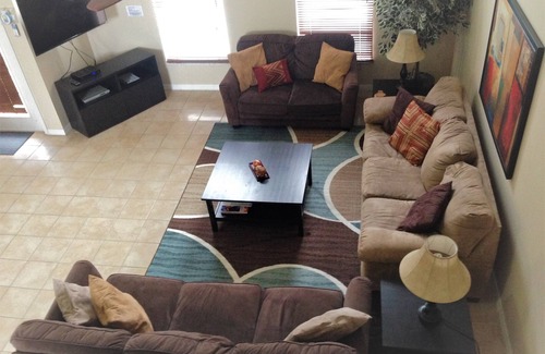 Our two-story with high vaulted ceiling vacation home has its own private screened in-ground pool, 2 car garage and enough living space to accommodate up to 10 people. Amenities such as cable TV, Sony Playstation2, Computer with high speed wireless internet, tennis court, playgrounds, basketball court and walking paths are all available for your enjoyment. Our affordable rates make it possible to vacation in more space for less money than you would spend to stay at a resort hotel.