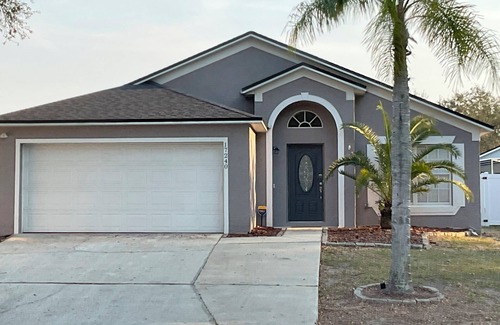 Get ready for your “PERFEKTPAUSE” relax and make wonderful memories in this 5-bedroom/3 bath pool house in Clermont. Close to Disney and Universal Studios and plenty of beautiful Golf courses. This cool property boasts 1 spacious Master bedroom with a king bed and ensuite bathroom with bathtub/shower combo, a 65 inch TV and a dedicated place to work, plenty of storage in the big walk-in closet. Second bedroom has a queen bed and a closet for storage space. The third bedroom has a queen bed, a 55 inch TV, a dedicated place to work and a closet for storage. The 2 theme kid's bedroom have both bunk beds (twin over full and 1 trundle) with plenty of storage and their own 55 inch TV. We also have a crib and a highchair at your disposal if needed. The 2 other bathrooms have showers, and are equipped with hair dryers and towels are provided. The living area is very spacious, and everyone can sit down and enjoy a nice movie on the big 85 inch TV. The dining area has a large table that can sit comfortably 8 people and there is also seating at the kitchen island. The Chef kitchen is spacious and perfect for making fabulous meals, it is completely furnished with everything you will need to cook and more! Convection/induction bran new range oven and the side-by-side fridge has ice and water dispenser. Coffee lovers will be pleased to have the choice with different kind of coffee machine: Nespresso, Keurig and drip coffee await :) A laundry room equipped with washer and dryer is at your disposal. The outdoor has an amazing big backyard to play outdoor games and a covered inground pool with pool accessories included (can be heated with a surcharge$) Nice patio area with big dining table and umbrellas for the sun, as we have sun all day long ) lounging chairs, hamac and a covered area with sofas to relax. BBQ grill at your disposal (25$ cleaning fee will be charged if used)Making it perfect for families or groups, guests will have all the comforts of home. Feel free to reach out to us during your stay - we're happy to suggest local spots to check out and fun things to do. There are beaches 1h15 min away if you want to take a break from the parks, we have beach chairs available, cooler and beach towels. If beaches are not your thing, and shopping is, well we have not one but 2 premium outlets nearby!!! So, fun for the whole family!!!! :)