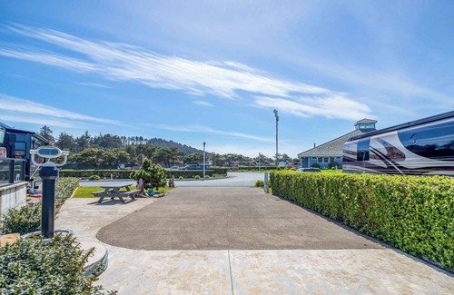 Stay a few steps away from the beach at the beautiful Pacific Shore Motorcoach Resort near Newport, Oregon.