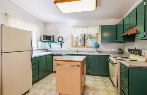 Enjoy sweeping forest views from the full kitchen, where you'll also find two ovens, a dishwasher, and a bar counter for your chopping sous chefs. The adjacent dining room features seating for six, while the gorgeous outdoor deck has a gas grill and patio seating for the warm summer months.