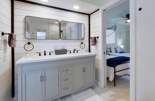 Inside, this water charmer has been tastefully decorated with a nautical theme with gorgeous pictures of sailboats and other sailing decor. The house has two separate areas, so it's perfect for two families that want privacy. The main area has a large dining room, a family room, and a well-appointed kitchen with stainless steel appliances and a large island. Prepare to show off your cooking skills and surprise your beloved family and friends with their favorite recipes! Then, gather in the inviting living area and enjoy an entertaining movie or show on the large TV. And if you are visiting during the cooler days, turn on the electric fireplace. Prepare refreshing beverages in the wet bar by the dining area. The separate area has two additional bedrooms. Both bathrooms have been fully renovated with modern fixtures and a rain shower.