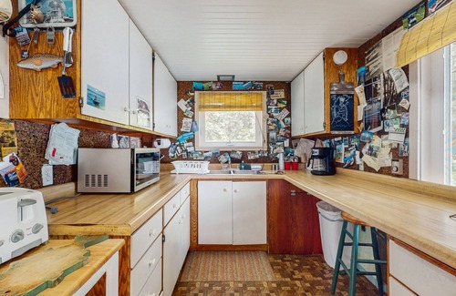 Start your mornings on the wraparound deck, sipping coffee as the sun rises over the lake. The outdoor dining area and gas grill create a perfect setting for afternoon barbecues after a refreshing swim. Inside, the living room is bathed in natural light from glass doors on three sides, providing stunning views of the water. The well-equipped kitchen invites you to whip up delicious meals, which you can enjoy at the dining table or on the deck. In the evenings, cozy up by the wood-burning fireplace or catch up on your favorite shows with the TV and VCR/DVD player.