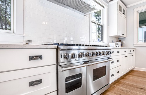 The gourmet kitchen is the dream of any family chef, with gleaming countertops and high-end appliances that include a French-door refrigerator and dishwasher, a large pantry, and a center prep island with breakfast bar seating for four, plus a high chair for the little one. The handsome dining table has plenty of seating for up to 10 dinner guests and there is a barbecue dining area right outside the screened porch with two picnic tables and a gas grill, perfect for your next grill session. Good thing too, because after a day on the lake with the home's complimentary rowboat, kayaks, and canoe, there's nothing like throwing a little char on some freshly caught fish!