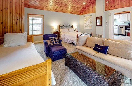 Just one mile from the beach, this warm and inviting space is the picture of comfort, with a TV with streaming capability, soft, carpeted floors, and even a separate kitchenette with a table for two and a corner sofa. Take advantage of the free WiFi to research a fun outdoor adventure or post today's memories to your social media, then head outside to hang out in the backyard's Adirondack chairs next to a warm fire in the firepit. Remote workers and students can use the private work table and WiFi to take care of those last-minute projects. The kitchenette's fridge, stovetop, dishwasher, microwave, coffee-makers, and toasters make it so you can prepare anything from a meal to a small snack. Fire up the shared gas grill to turn out some delicious barbecue on the deck furnished with covered tables and chairs. Wind down for the night after using the walk-in shower, then fall asleep in either the queen or twin rollaway bed. The shared washer/dryer will ensure everyone looks their best during your stay, so you can even afford to pack light for your trip!