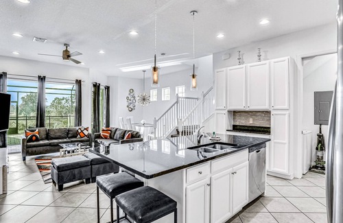 Located 11 miles from Walt Disney World Resort and 20 miles from Universal Studios, this spacious five-bedroom townhome is great for families and groups looking for the perfect home away from home. Home can comfortably accommodate up to 10 adults and 4 children. Take advantage of the secluded screened lanai with a private outdoor pool and a propane grill to enjoy the Florida sun. Inside, this home features an open-concept living area that is perfect for relaxing after a day of fun. Get comfy on the sectional sofa and stream your favorite movies or series on the large smart TV. The open kitchen is well-equipped with modern stainless steel appliances and a sparkling two-person center island. The entire main living space is on the first floor along with one private bedroom, equipped with a smart TV and an en suite bathroom. The rest of the bedrooms are located upstairs. Additional amenities include a washer/dryer on-site, high-speed WiFi, and central AC. Guests will have free access to the clubhouse where they'll find a gym, mini putt-putt golf, a pool, and a kids' play area. Although this home is pet-friendly all dogs must be 2 years of age or older.