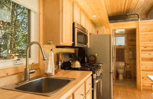 The house is very comfortable and modern with a cabin feel. It has a gas stove. Separate bedroom with nice queen mattress. TV with a dvd player and a number of classics the owner loves, no cable. Heated and cooled by a brand new Mitsubishi split system. A couch that folds down into a bed and a teeny tiny sleeping loft that has a firm full sized mattress. Tinyhouse is setup with self checkin. Recommended for two adults in bed and children on brand new leather futon sofabed. The loft bed is very very small (a full) and a very tight fit. Slept there once with 6’2 friend and we had to time our side turns and our faces were an inch from the ceiling.