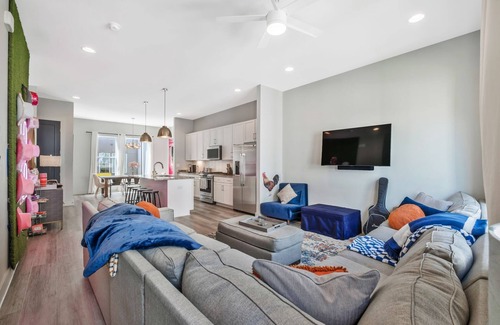 Magnificent Rooftop, Trendy East Nashville, Large Home! Welcome to Dolly’s Dreamhouse, a one-of-a-kind property perfectly located in vibrant East Nashville—just minutes from downtown! Designed for comfort, fun, and unforgettable gatherings, this spacious home is ideal for family reunions, bachelorette groups, couples, or friends traveling together. Sleeping Arrangements - 5 separate sleeping areas, 3 full bedrooms, 2 king beds, Double bunk bed (full size) plus Twin bunk beds, and 2 additional twin beds plus 1 futon! 4 bathrooms with luxurious glass showers with instant-hot water, so everyone can shower at once! All bathrooms have full amenities, new blow-dryers, magnifying mirrors, luxury linens, shampoo, conditioner, and body wash. Entertainment and Amenities: Large dining room and living room area with bonus sleeping options (3 twins and 2 bunk beds) Large TV’s in every bedroom plus big screen in living room and an 80” projection screen on the fully furnished and wonderfully decorated rooftop. Rooftop has a full dining room table and chairs, sofa, chairs, barbecue grill, fire pits, family sized umbrella for shade, cornhole games, projection TV, light up billboard marquee, (containing all the letters for you to write your special greeting!). Chef’s kitchen with oversized refrigerator, gas oven, stove plus griddle. Full-sized washer, dryer, iron, steamer. 2-car garage with electric garage door opener for convenience. Whether you’re enjoying movie night on the rooftop, cooking together in the chef’s kitchen, or gathering around the fire pit, Dolly’s Dreamhouse is designed to bring people together and create lasting memories.