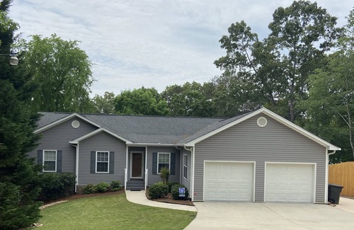 Downstairs are one queen bedroom, one bedroom with two twin beds (not bunk beds) and a full bathroom. There is also a fun bar area downstairs with a pool table, seating, and television where your entire crew will have plenty of space to hang out. A second entrance on the downstairs level opens to a beautiful view of Lake Hartwell.